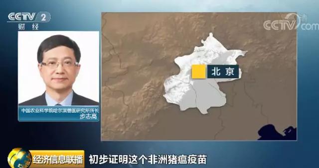 中国农业科学院哈尔滨兽医研究所所长 步志高:通过实验室的研究,初步证明这个非洲猪瘟疫苗是安全的、有效的。同时,我们还通过实验室这个产品的研究,解决了这个非洲猪瘟疫苗大规模生产的工艺的问题,建立了非洲猪瘟疫苗产品的质量标准。步志高介绍,目前中间试制的产品已经基本完成安全性和有效性检验,预计9月中旬完成这项工作,已向农业农村部提出生物安全评价申请。