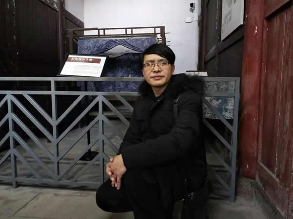 图11:唐良闻在聂荣臻元帅出生卧室半蹲留影