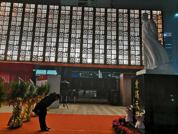 图30:夜深人静还有陶子在纪念馆前给陶行知先生雕像鞠躬
