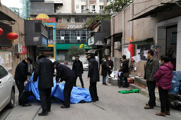 图二:内江市公安局市中区分局警察在为小区搭棚