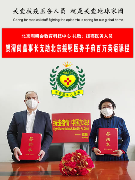 2020鼠年伊始,贺渭闳董事长曾学习、工作、生活过的地方——武汉爆发了新冠肺炎疫情,他大力支持北京市陶行知研究学会(筹)提出的“关心抗疫医护人员,就是关爱地球家园”的理念,作为天津和丰盛世教育咨询有限公司的董事长,他希望为北京援鄂抗疫医务人员子弟支助英语王牌课程,以此表达一个武汉某军校退伍爱国老兵对白衣战士最崇高的敬意!