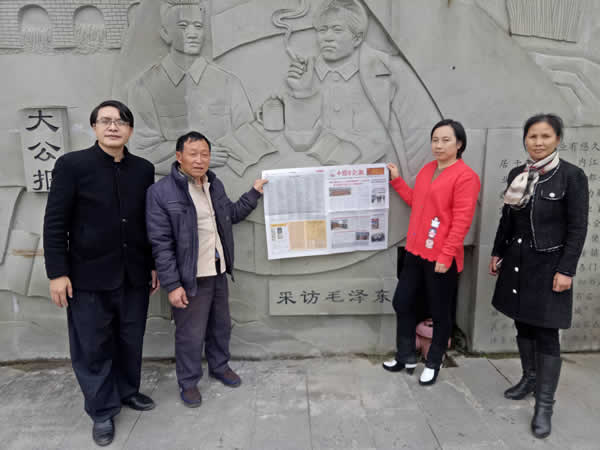 图三:唐良闻、陈辉与内江村民苏全芳、毛主席红卫兵黄富才手持《中国日记报》在毛主席与范长江雕像前合影