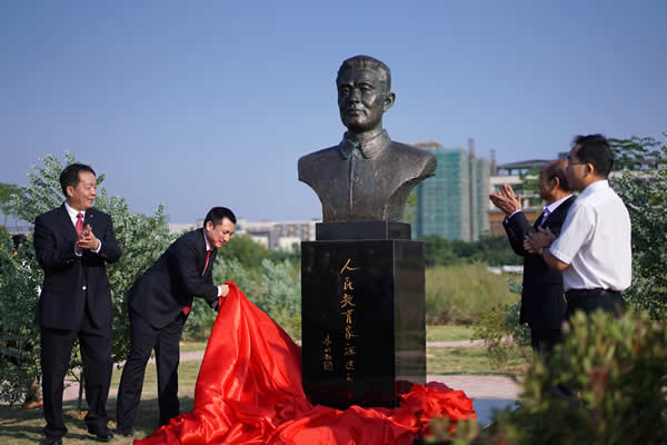 图三:汪达之先生长孙汪汀博士左2),汪达之研究专家、特级教师刘友开同志右2)等应邀为广东技术师范大学汪达之先生铜像揭幕