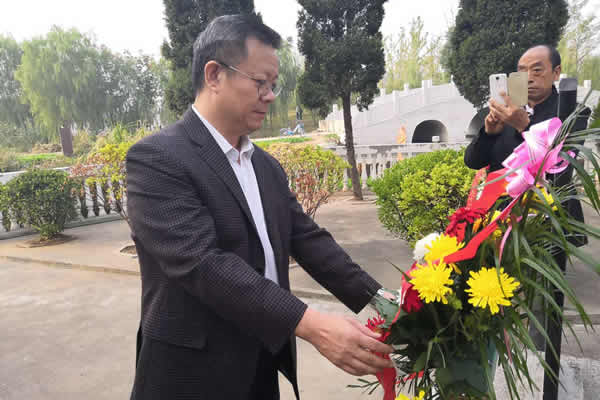图五:广东技术师范大学骆少明校长向人民教育家汪达之先生之墓敬献花篮