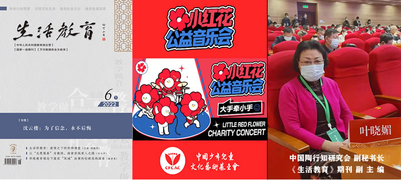图一:国家一级期刊《生活教育》支持“大手牵小手”小红花公益音乐会(右:《生活教育》副主编叶晓媚老师2021年10月18日出席在南京举办的纪念陶行知先生诞辰130周年活动)