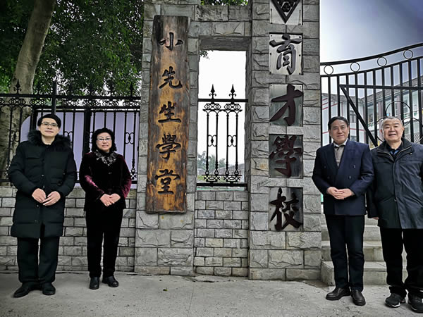 图六:笔者唐开元(左一)与《生活教育》复刊主要倡导者崔祖瑛书记(右二)、扩刊主要倡导者和推动者叶晓媚老师(左二)在重庆市合川区育才学校门前合影