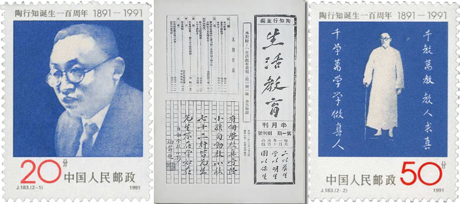 图七:陶行知先生诞生100周年,国家邮政主管部门发行了纪念邮票,中图为陶行知先生1934年创刊的《生活教育》(半月刊)创刊号