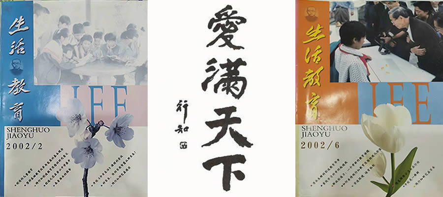 图八:复刊前以内刊形式试刊的《生活教育》(图为2002年2月、6月),中图为陶行知先生书法及核心教育理念之一“爱满天下”(照片提供:北京市第十七中学蒋金海)