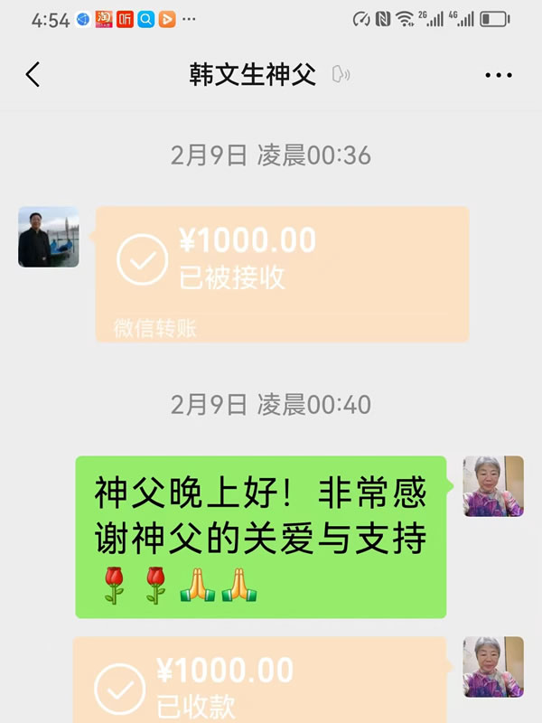 图三:曾重新女士感恩北京韩文生神父的关爱